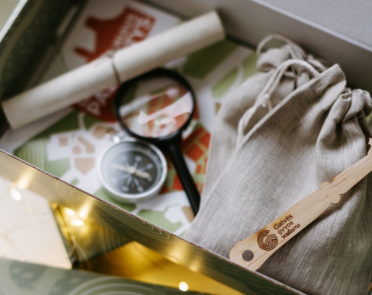 - Įvairūs į istorines patirtis įtraukiantys daiktai: kunigaikščio laiškas, metras gynybinei sienai išmatuoti, kompasas kelionių krypčiai nustatyti, kaladėlės gotikinei sienai konstruoti… Šie daiktai reikalingi atliekant orientacinio žaidimo užduotis. Tai žadina smalsumą ir suteikia papildomo smagumo! Daiktai patogiai supakuoti lininiame maišelyje. Dalis jų vėliau gali būti pritaikomi namuose ar kituose vaikų žaidimuose.